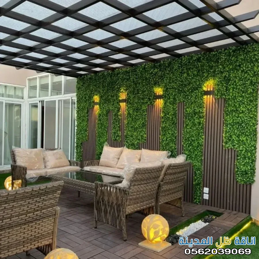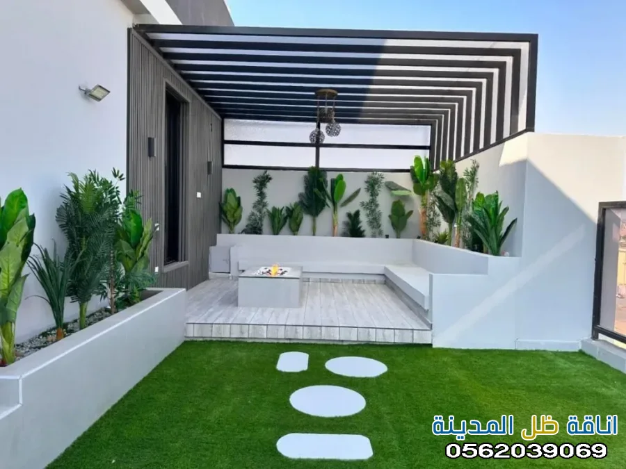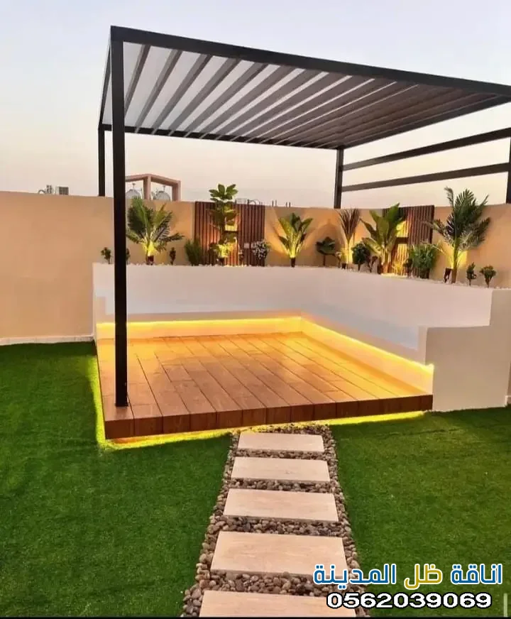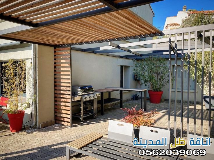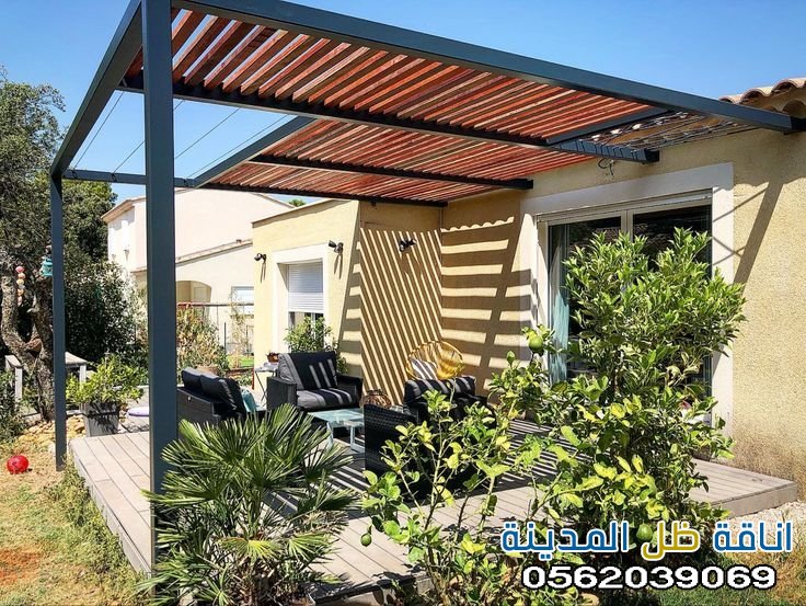 - المظلات الخشبية (البرجولات): تضيف لمسة كلاسيكية أو ريفية دافئة. يتم استخدام الأخشاب المعالجة (مثل التيك أو خشب السنديان) لمقاومة الرطوبة والحشرات.