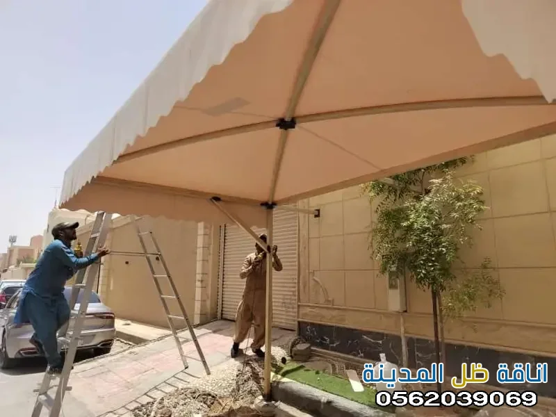إعداد الأساسات والتثبيت: يتم حفر الأساسات وصب الخرسانة أو تركيب المراسي المعدنية لتثبيت الأعمدة. هذا هو أهم جزء لضمان عدم انهيار المظلة.